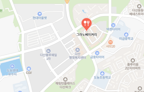 그라노베이커리는 현대아울렛에서 대각선, 다산행정복지센터 맞은편 길 건너 주택단지에 위치해 있습니다.