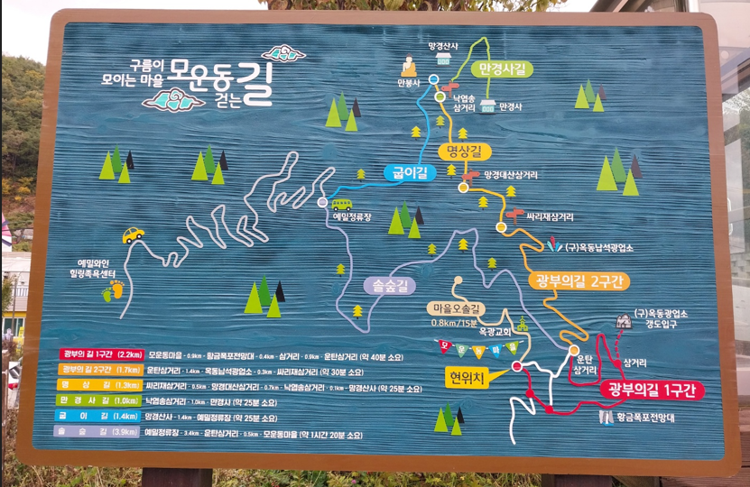 1코스는 찻길을 많이 걷게 되며, 출발시간이 늦어 다시 안내센터로 돌아오는 것은 추천하지 않는 다고 하시네요. 약 2시간 코스로 3코스인 "모운동 벽화마을 코스"를 추천하셨고, 풍경이 가장 아름다운 코스는 5코스를 추천해 주셨습니다.